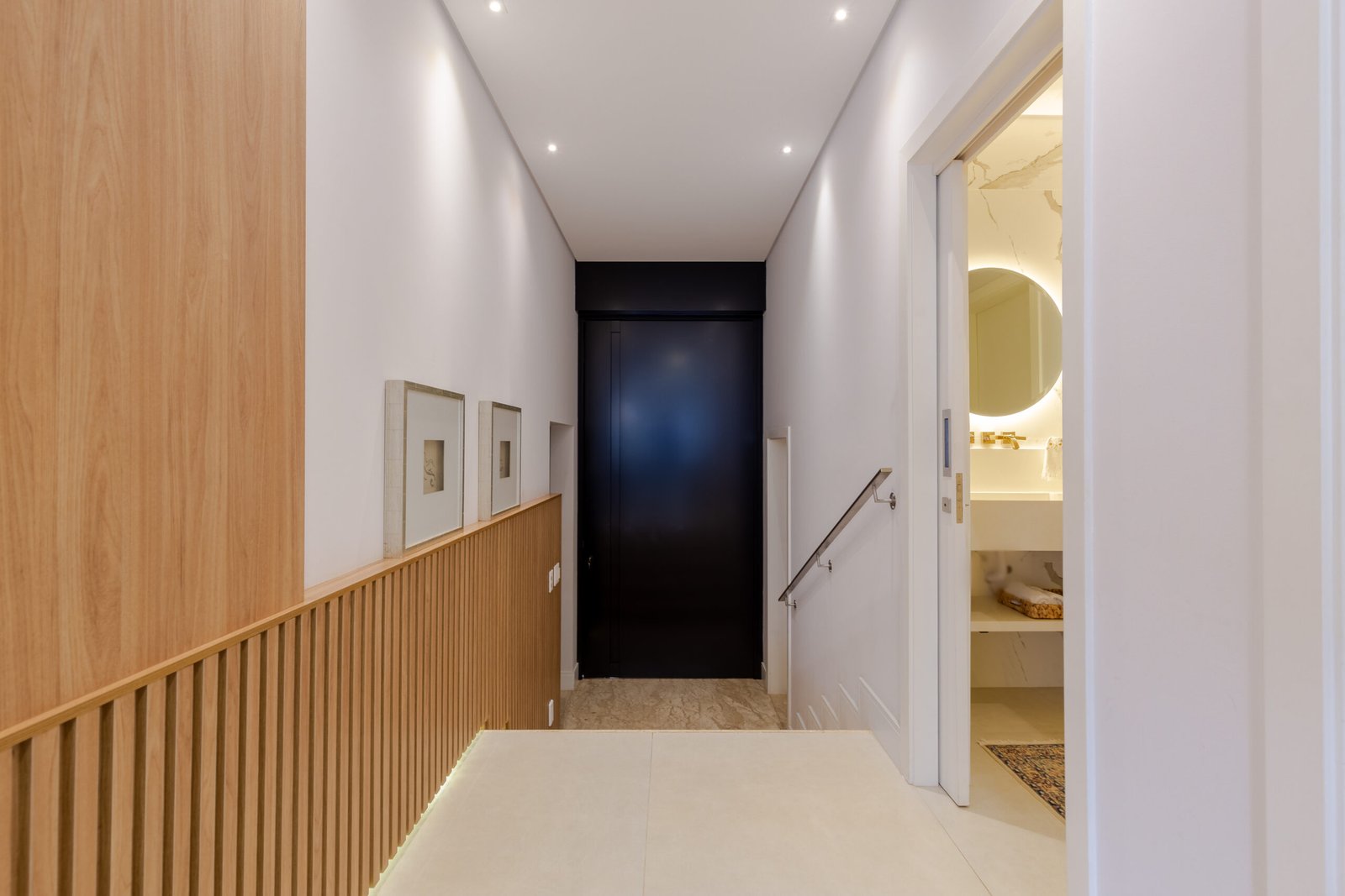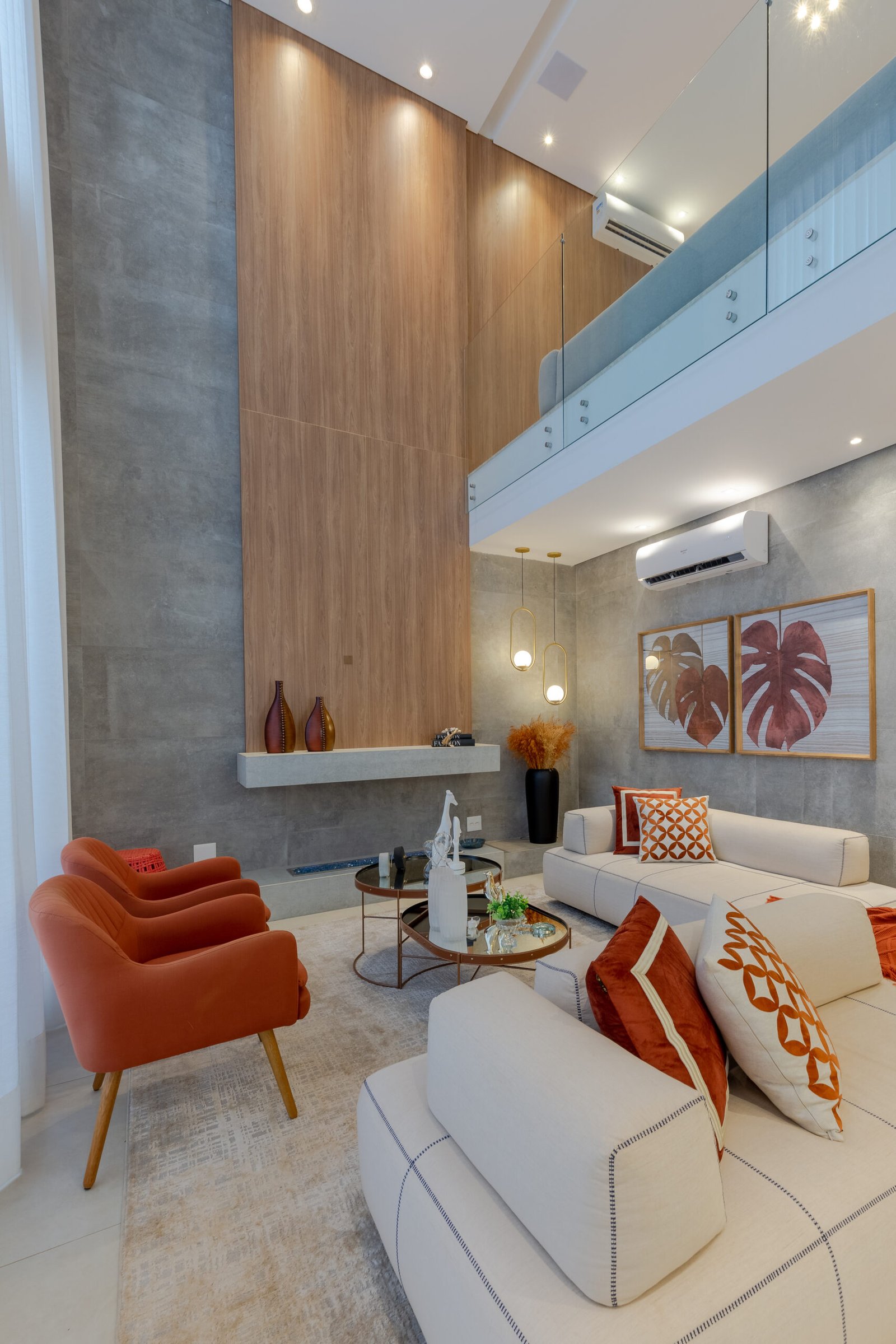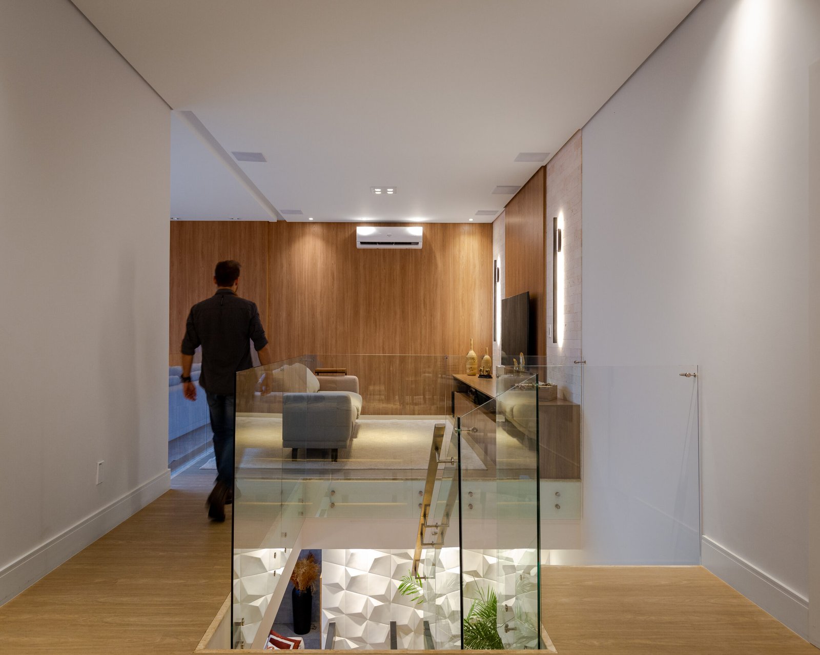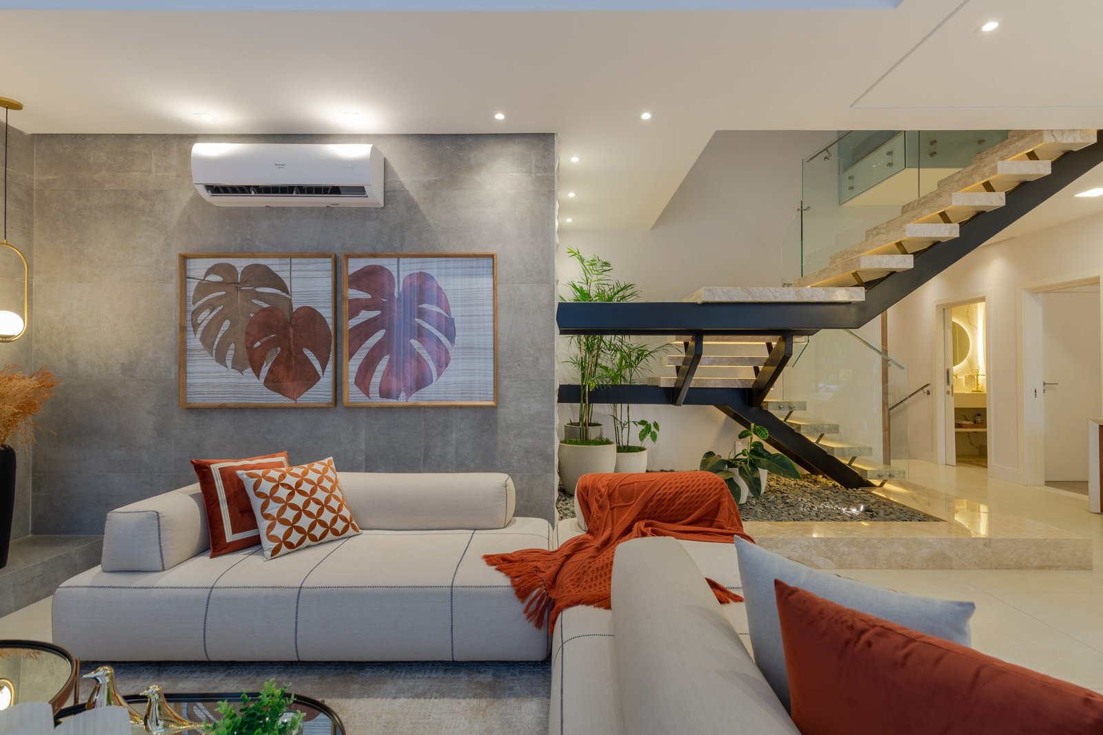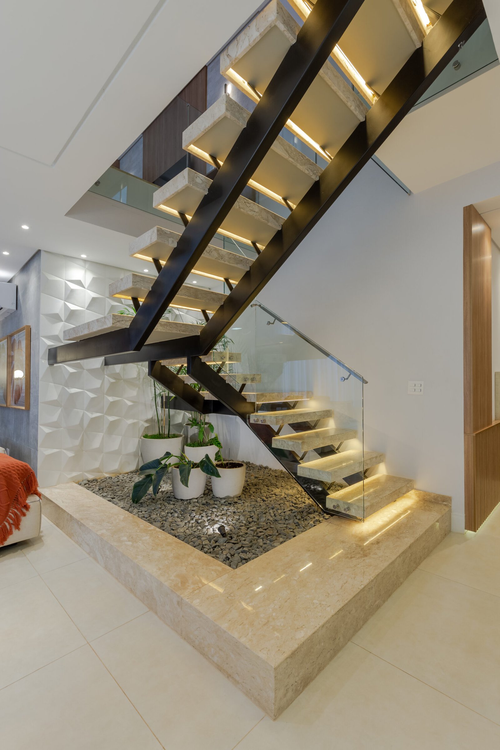 A área interna, por sua vez, complementa a proposta, exibindo ambientes sociais amplos e uma escada com degraus flutuantes, que serve como um ponto focal elegante.