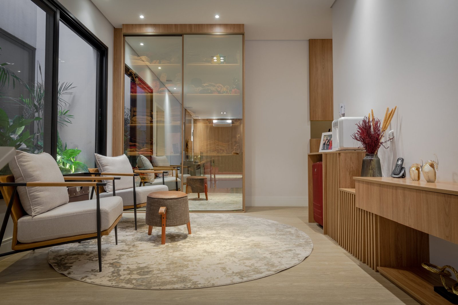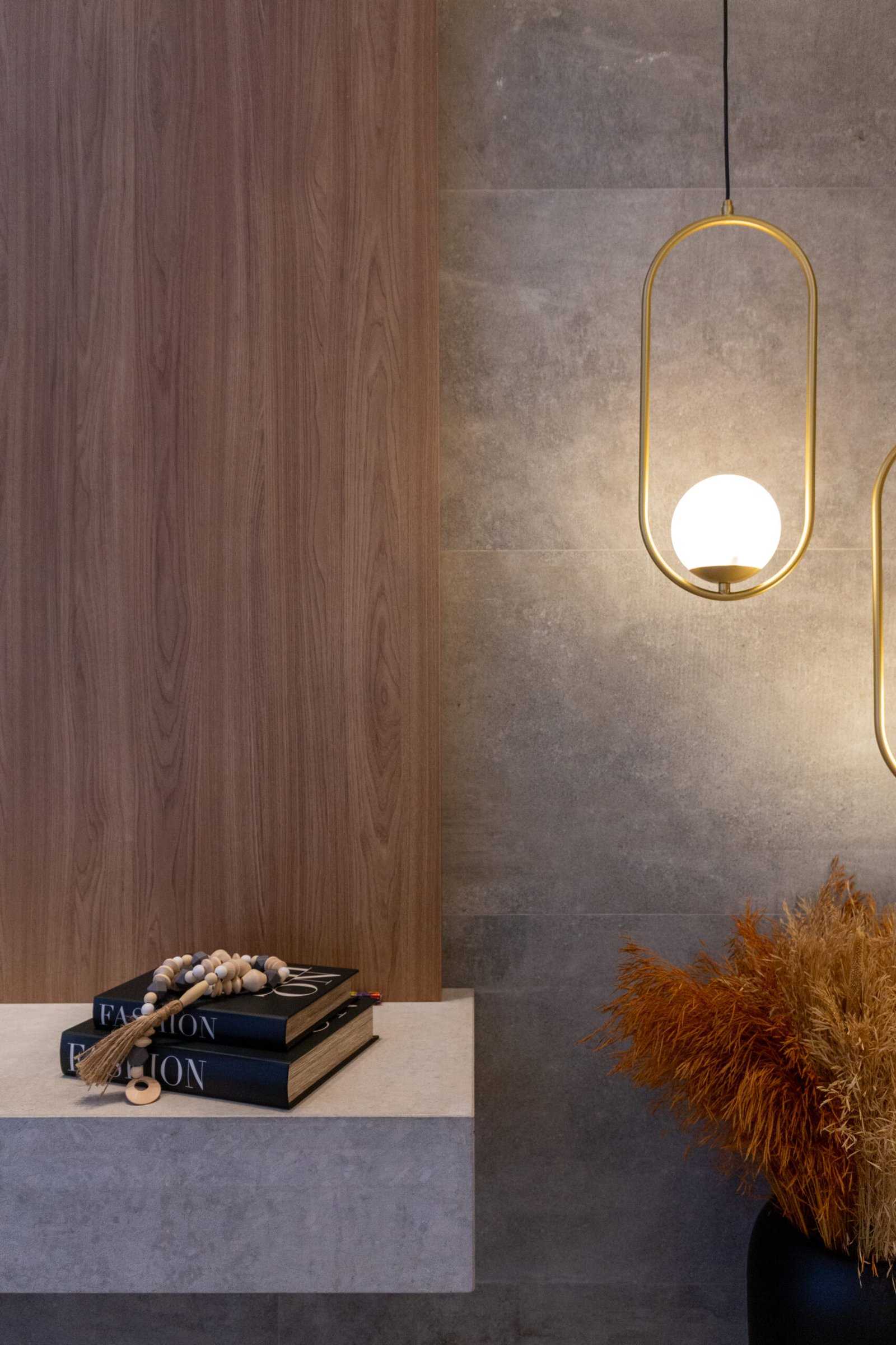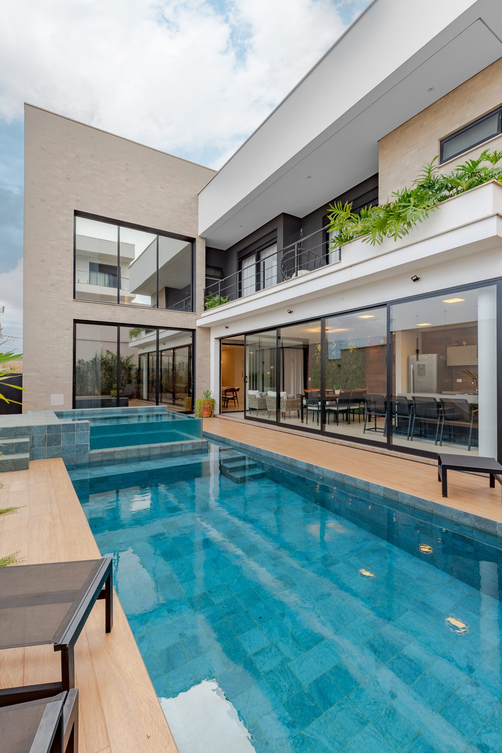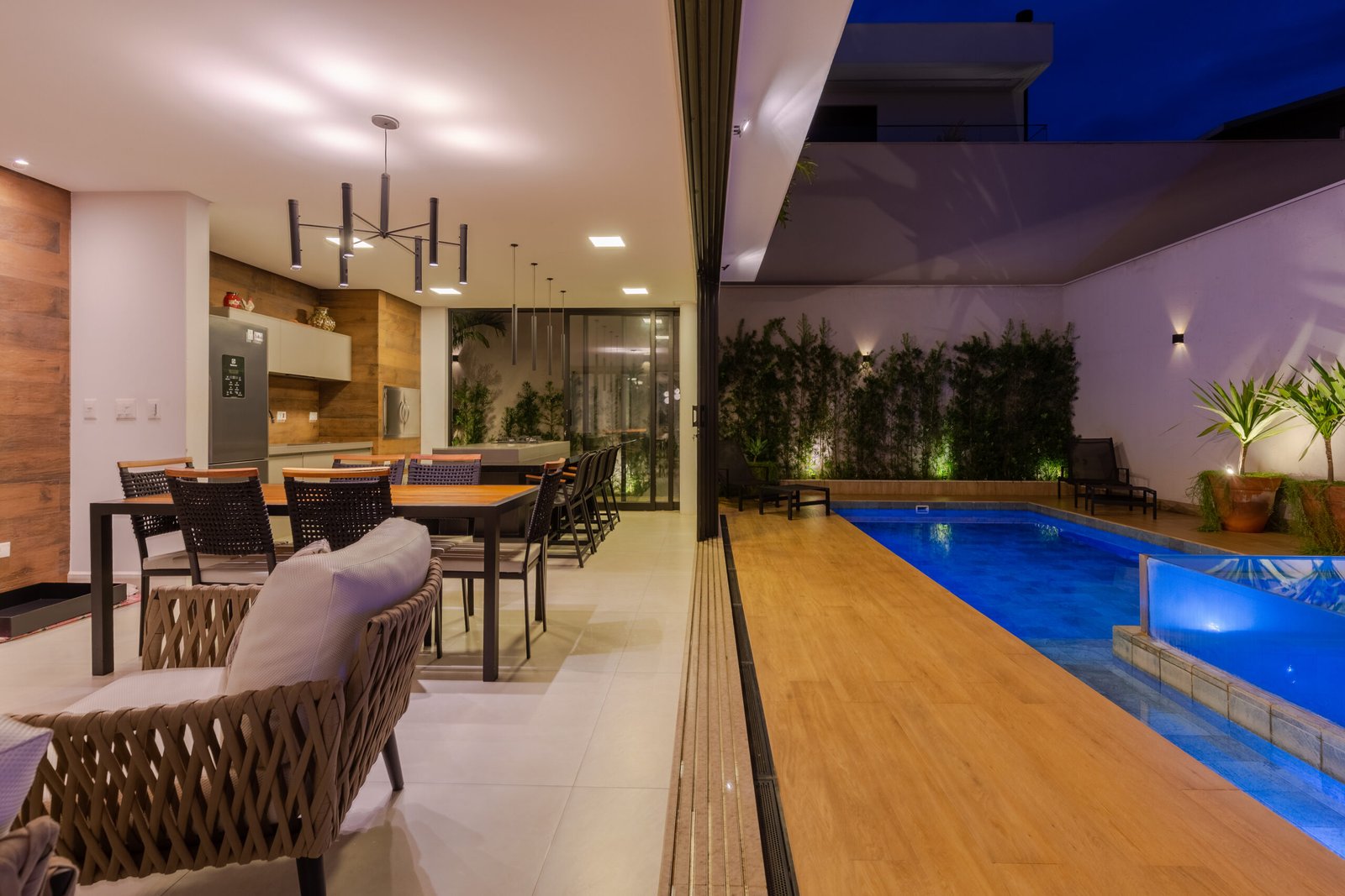 A transição para a área de lazer revela um diálogo primoroso entre o interior e o exterior, com grandes portas de vidro que conectam a área social à piscina. Essa integração não só amplia visualmente os espaços, mas também cria um ambiente ideal para receber e desfrutar de momentos especiais com amigos e familiares.