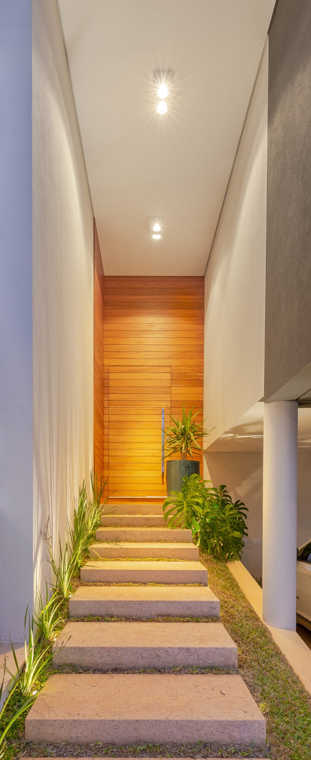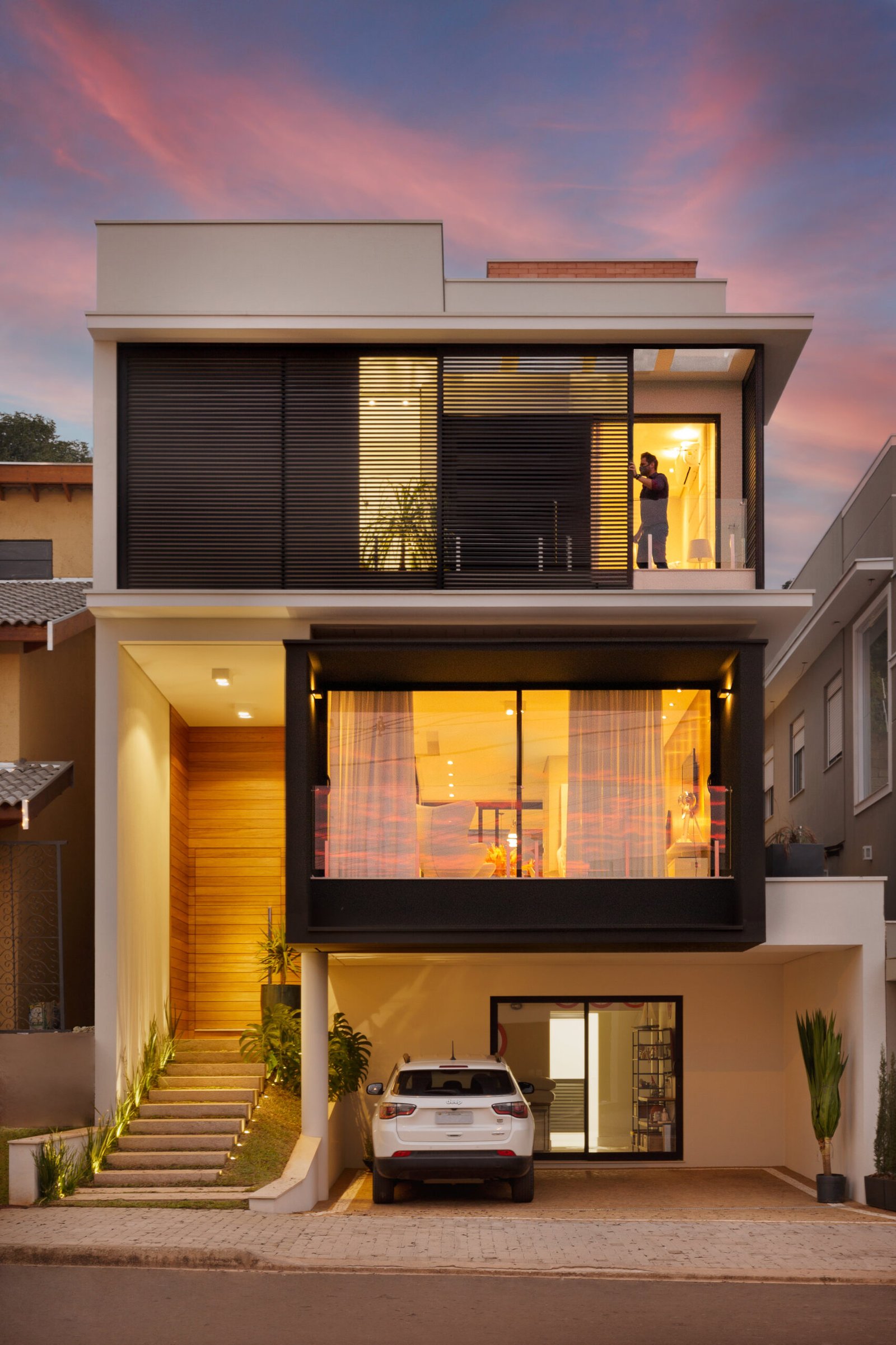 Residência que responde de forma assertiva aos desafios de um lote complexo, com acentuado aclive, orquestrando um projeto de três pavimentos com notável habilidade.