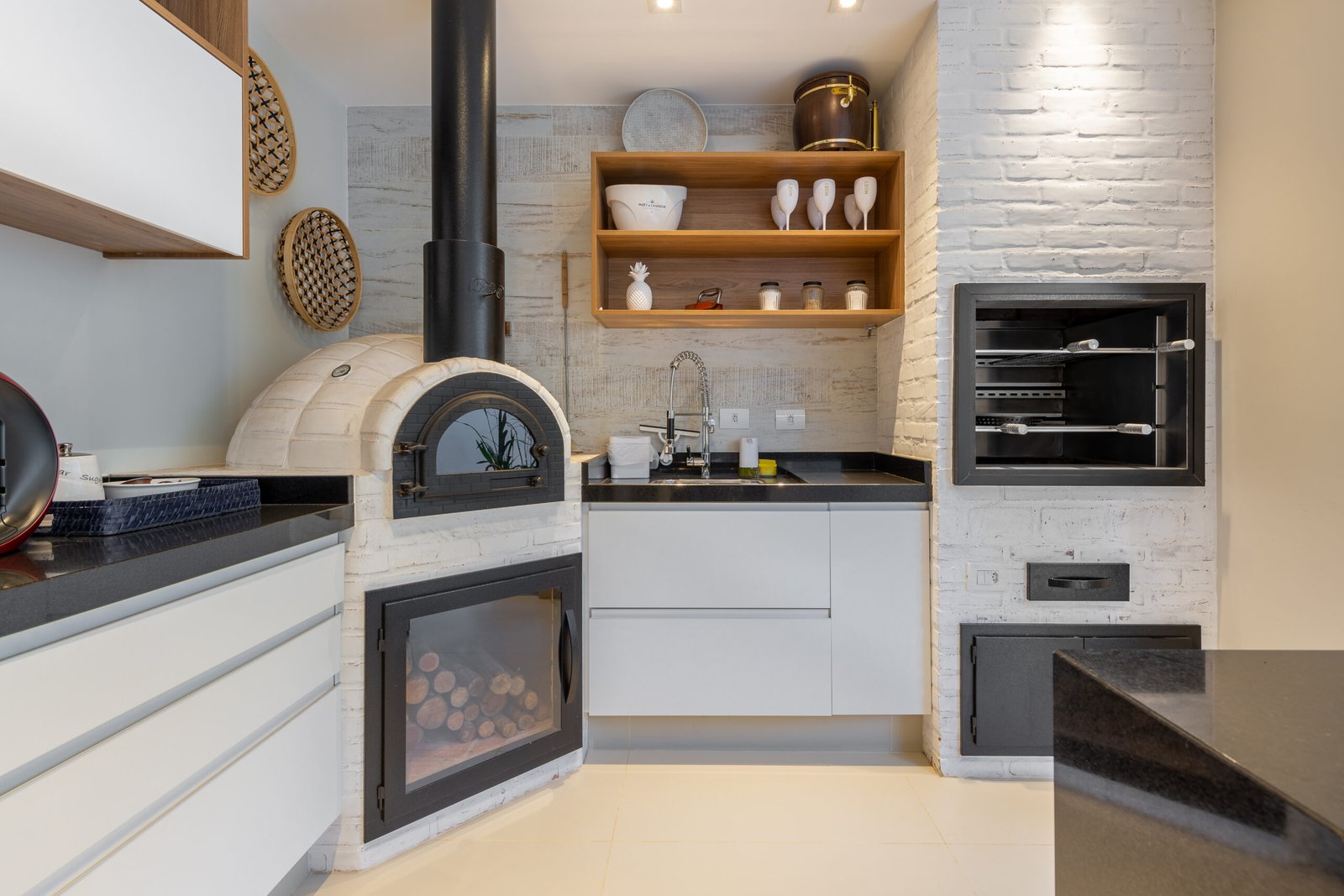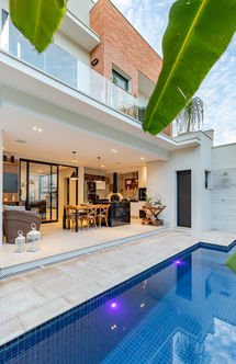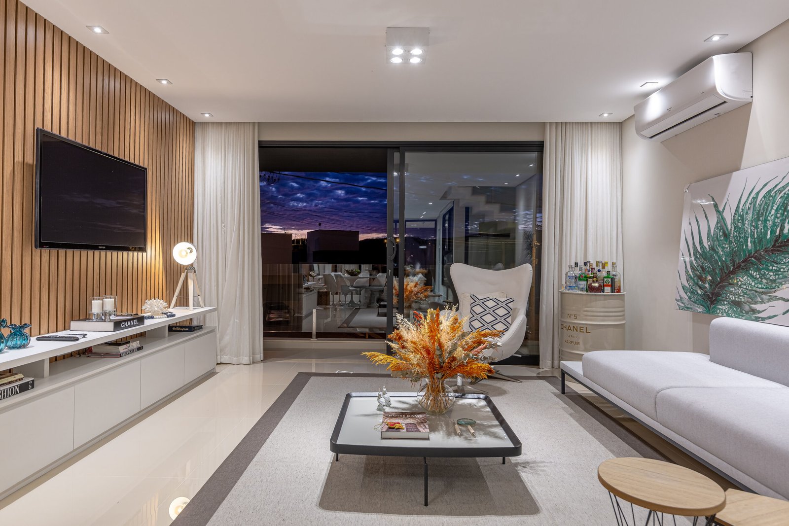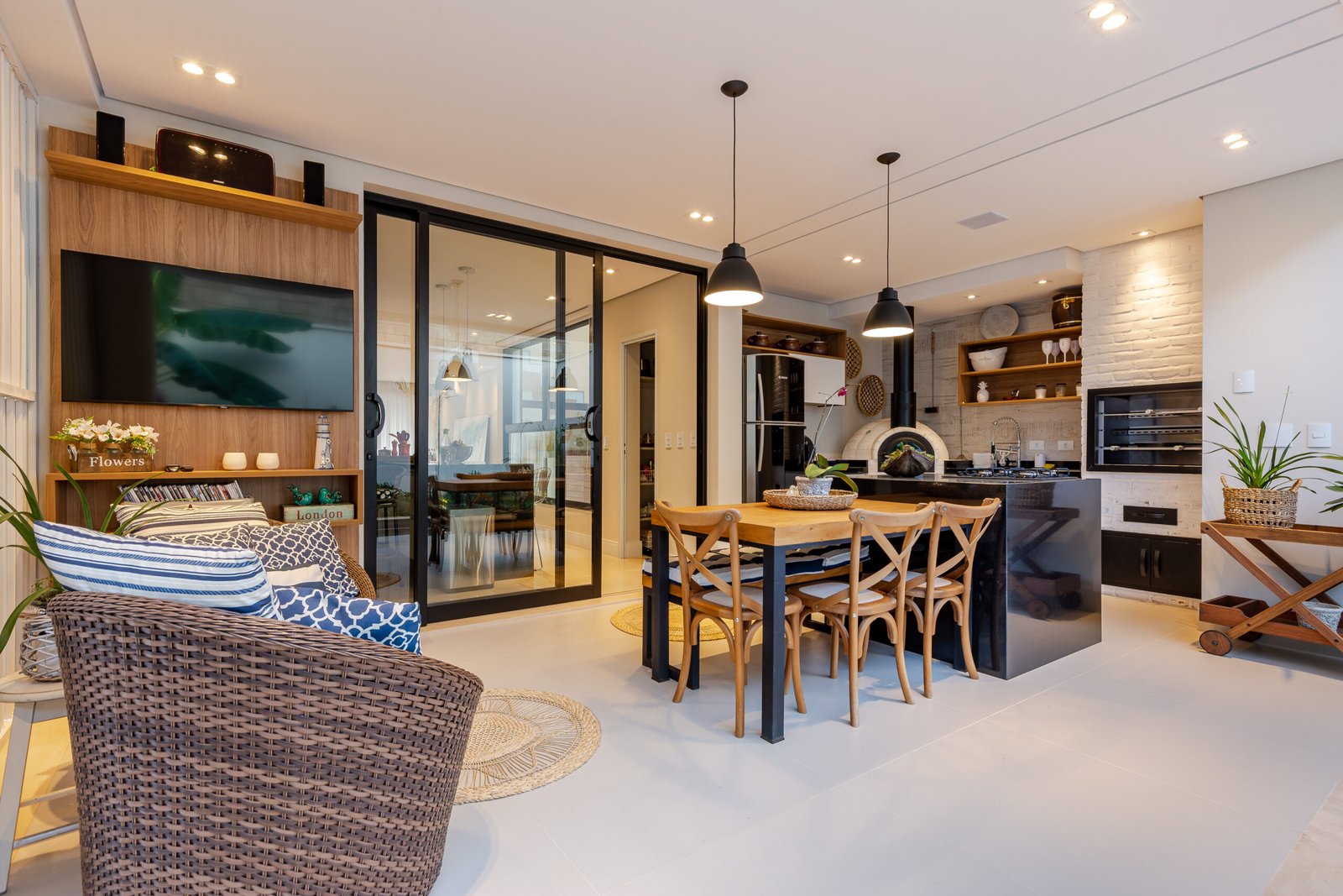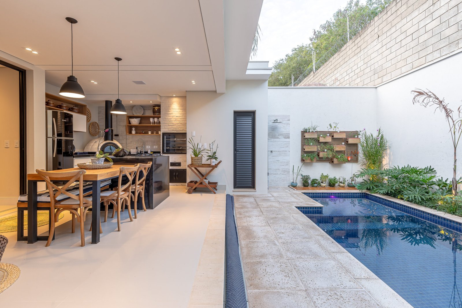 Na sala de estar, a integração com a área externa expande visualmente o espaço, enquanto a área gourmet e a piscina demonstram uma preocupação com a funcionalidade e o lazer.