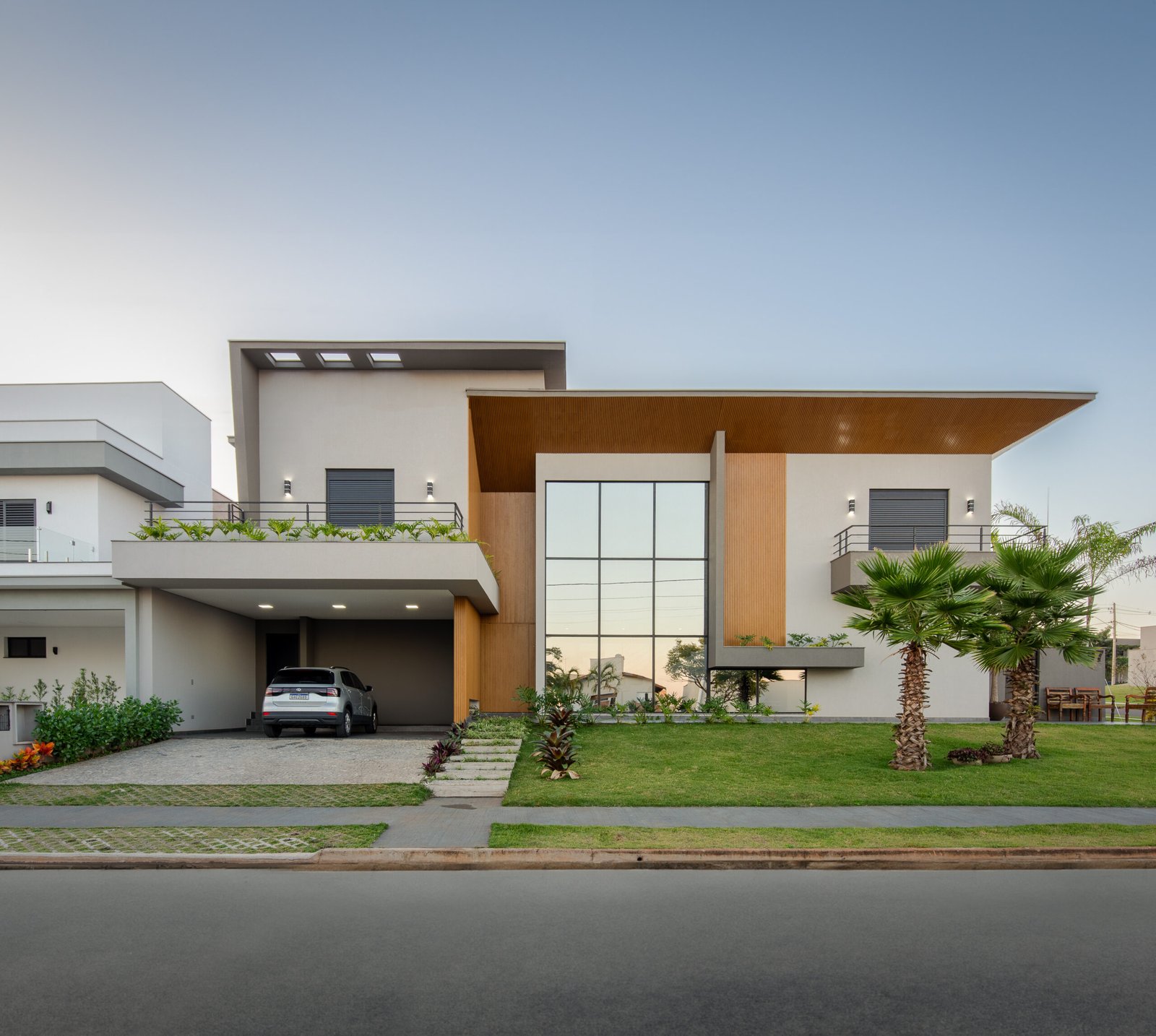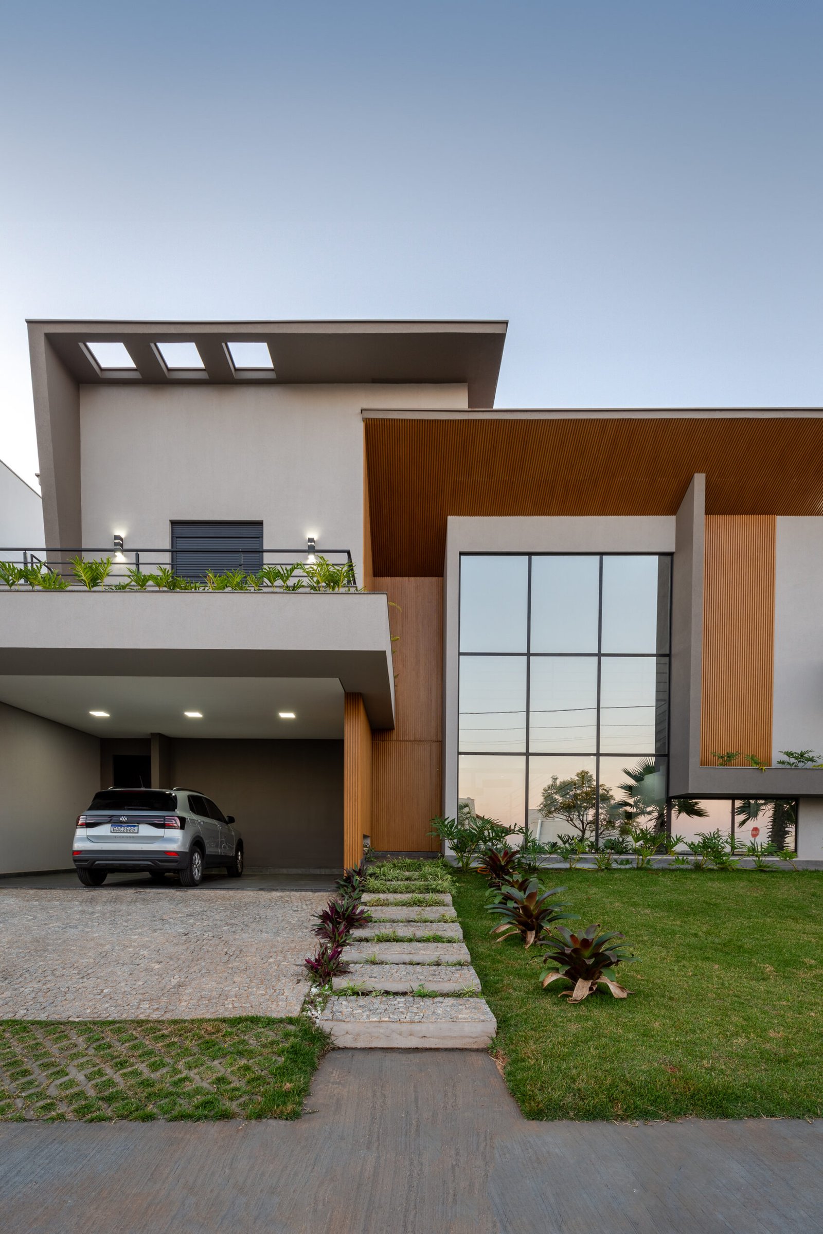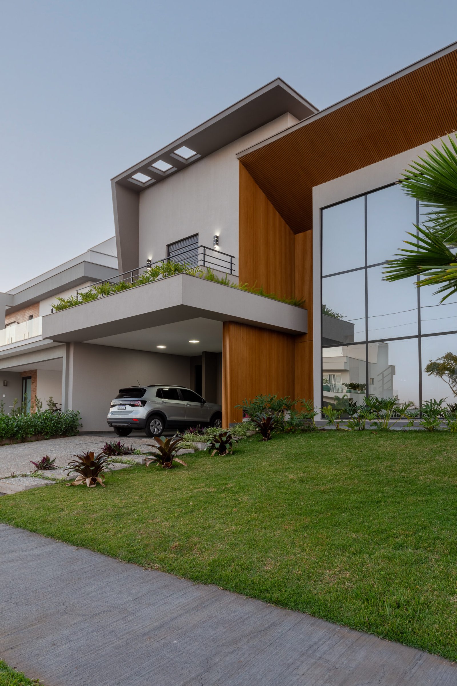 Com uma presença marcante e uma estética inegável, esta residência emana a essência da arquitetura contemporânea, capturando o olhar com sua combinação de formas geométricas ousadas e materiais sofisticados. O destaque da fachada é um pórtico angulado em madeira, que enquadra a entrada e a grande janela envidraçada, criando um contraste visual impactante. O uso da madeira confere calor e textura, equilibrando a frieza dos caixilhos em preto e com o cimento queimado.