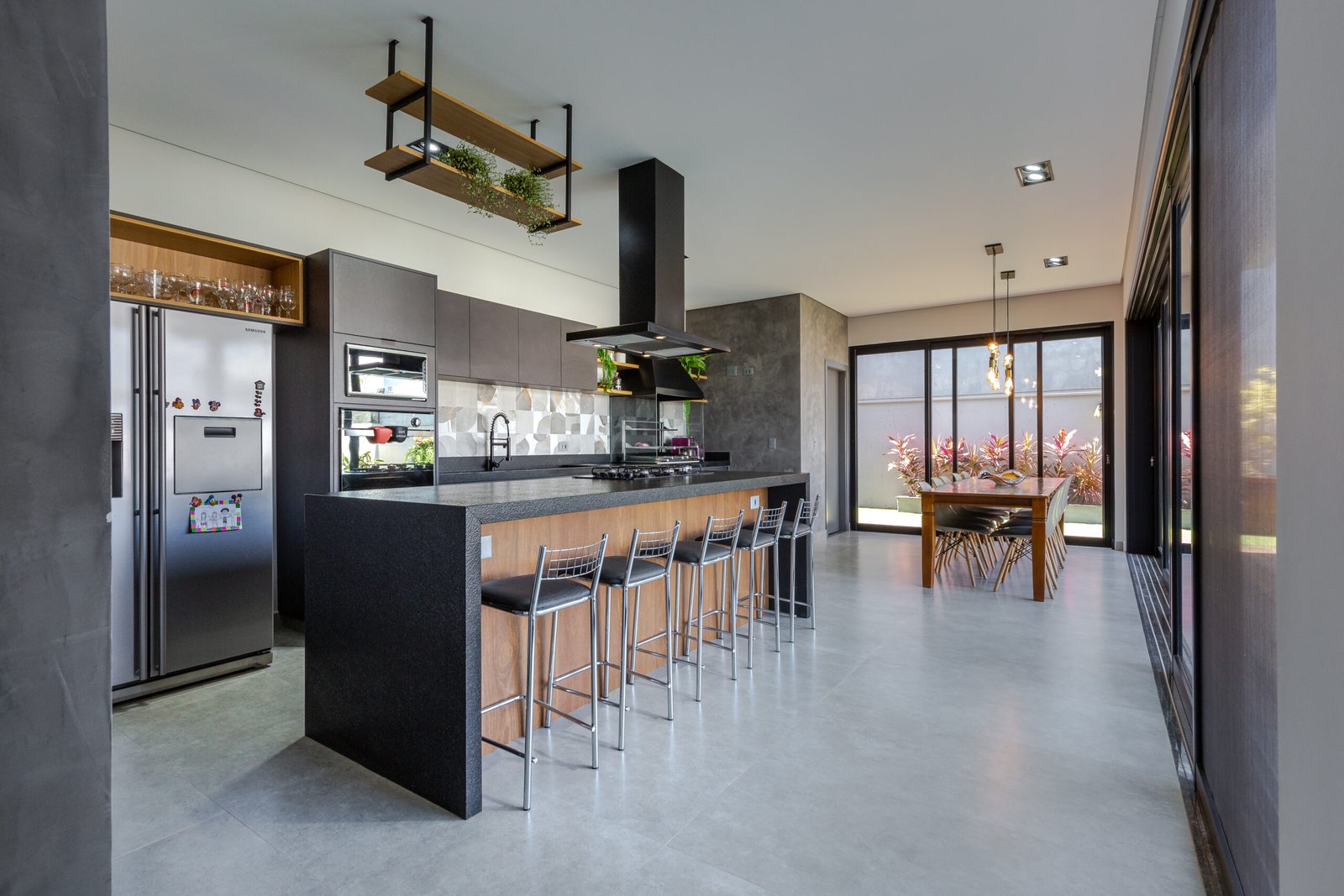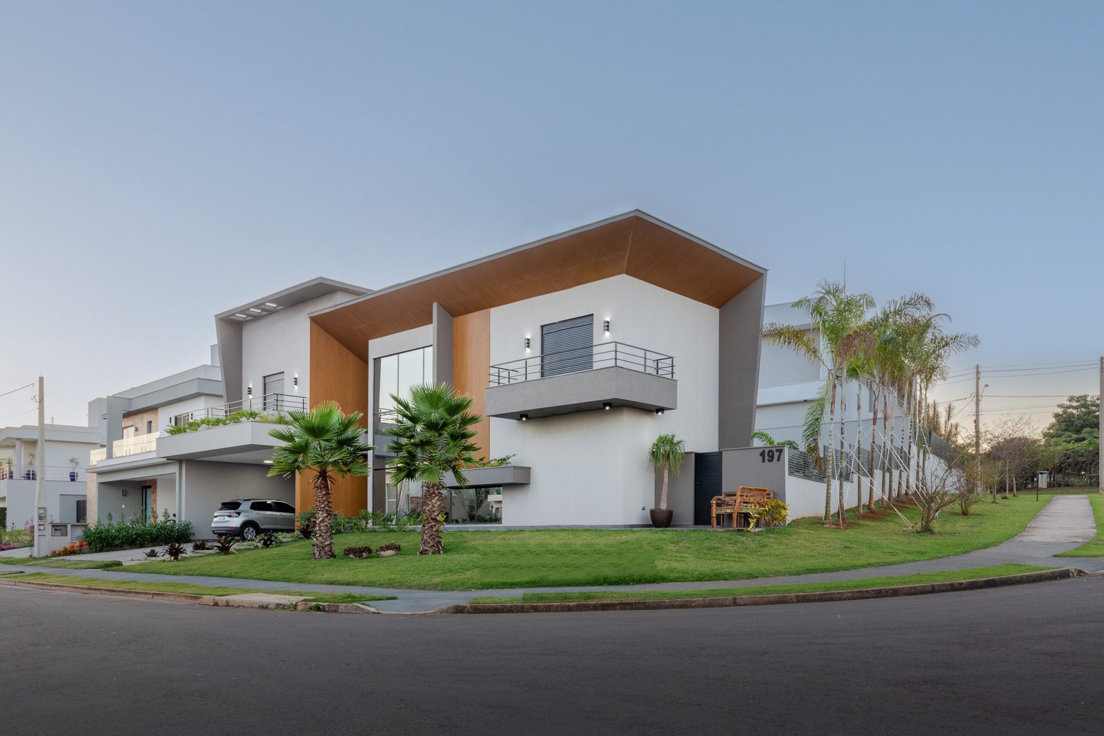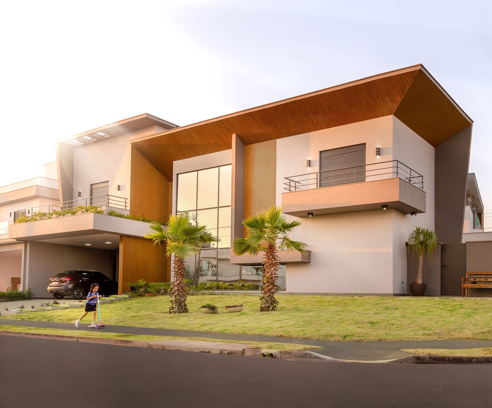 Com uma presença marcante e uma estética inegável, esta residência emana a essência da arquitetura contemporânea, capturando o olhar com sua combinação de formas geométricas ousadas e materiais sofisticados. O destaque da fachada é um pórtico angulado em madeira, que enquadra a entrada e a grande janela envidraçada, criando um contraste visual impactante. O uso da madeira confere calor e textura, equilibrando a frieza dos caixilhos em preto e com o cimento queimado.