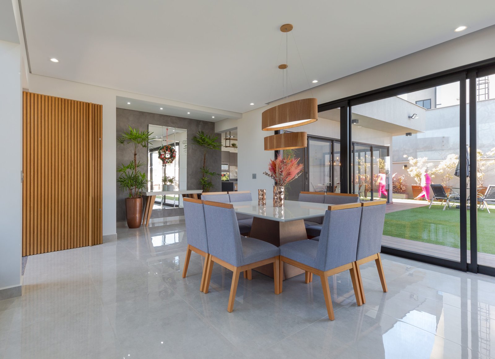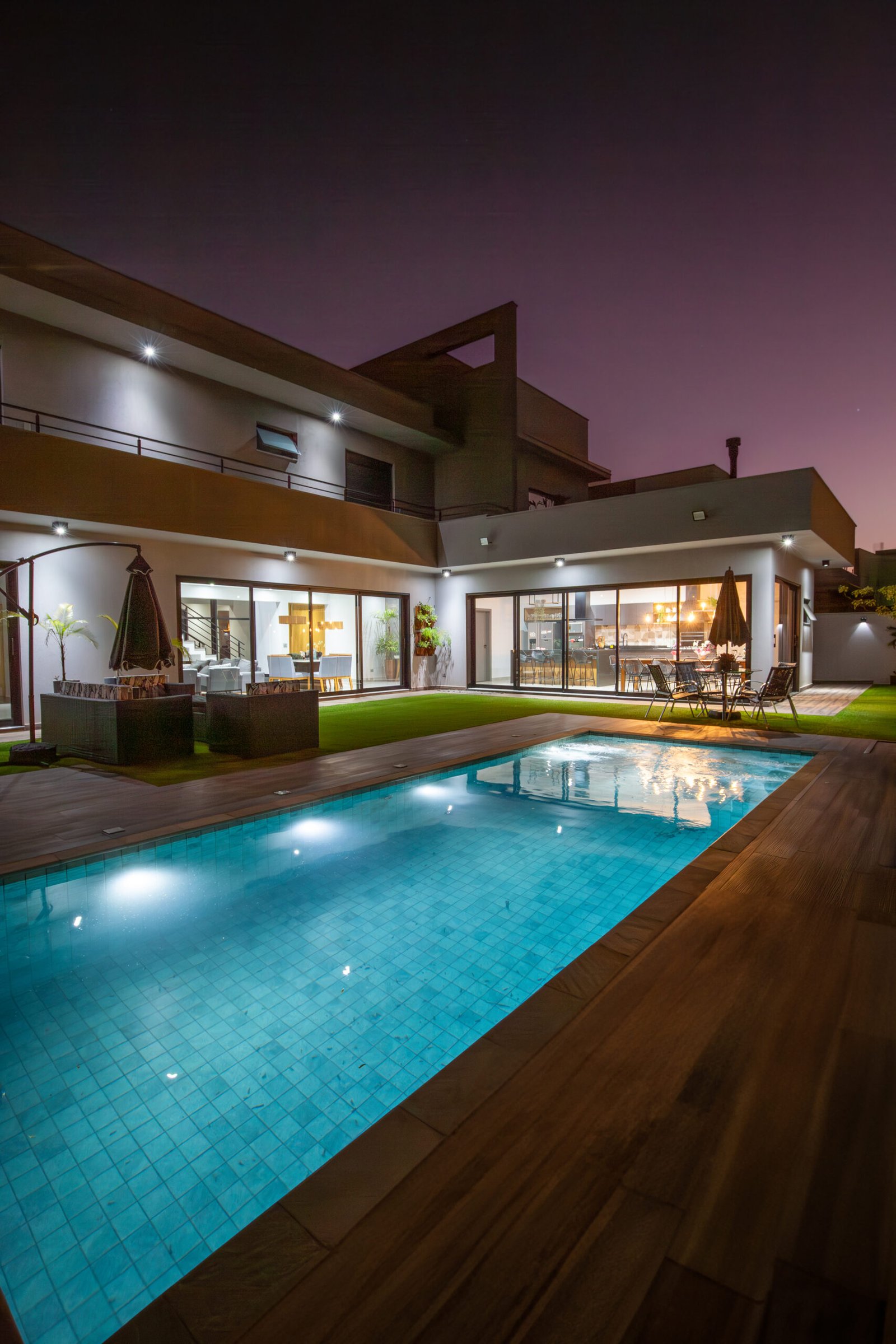 Grandes superfícies de vidro reflexivo definem o caráter da casa, diluindo as barreiras entre o interior e o exterior. Durante o dia, o vidro capta e reflete o entorno, enquanto à noite, ele revela a iluminação interna, transformando a fachada em uma tela dinâmica de luz e sombra. Essa transparência estratégica inunda os interiores de luz natural e oferece vistas panorâmicas, conectando os ambientes internos com a paisagem externa.